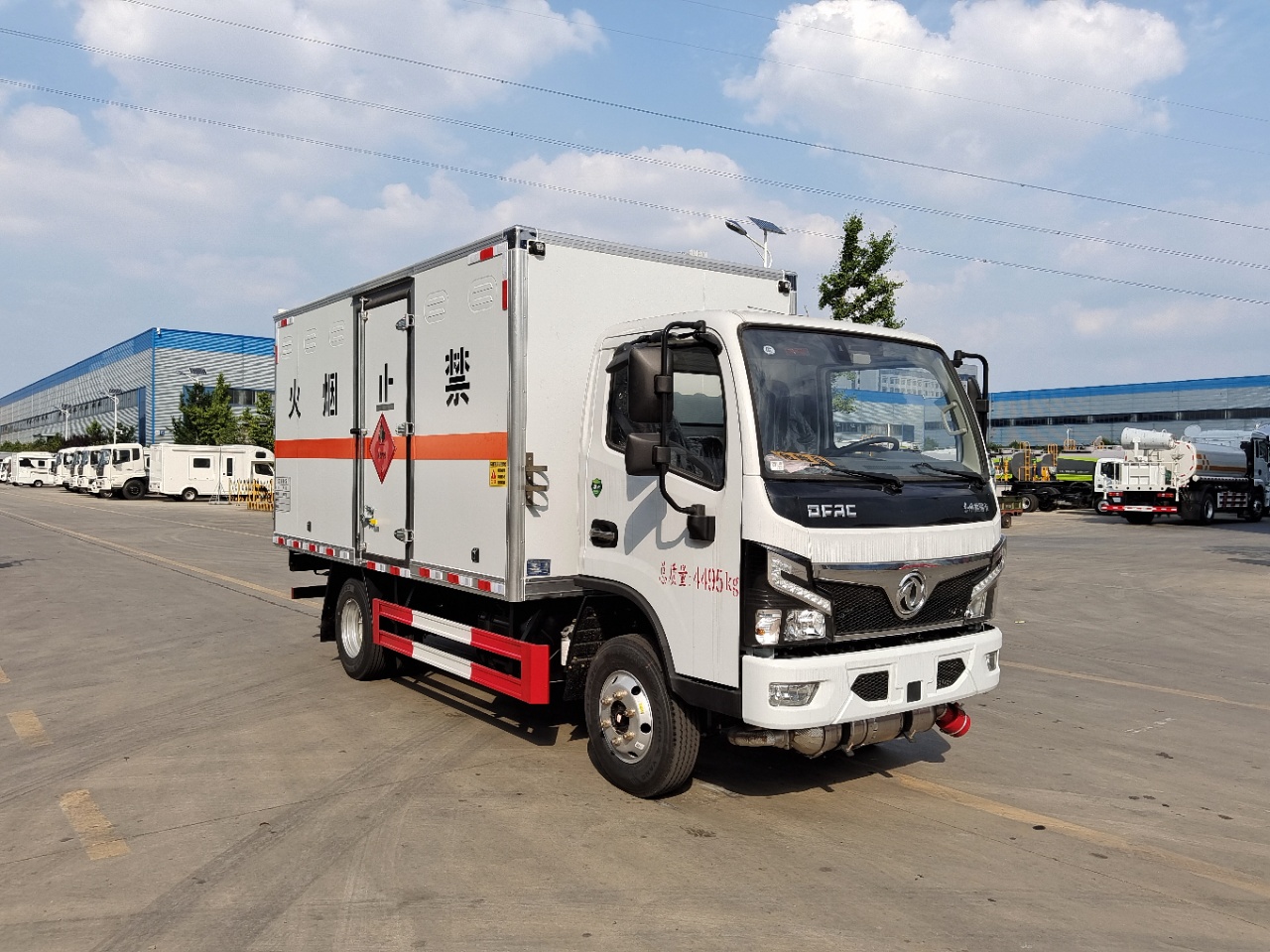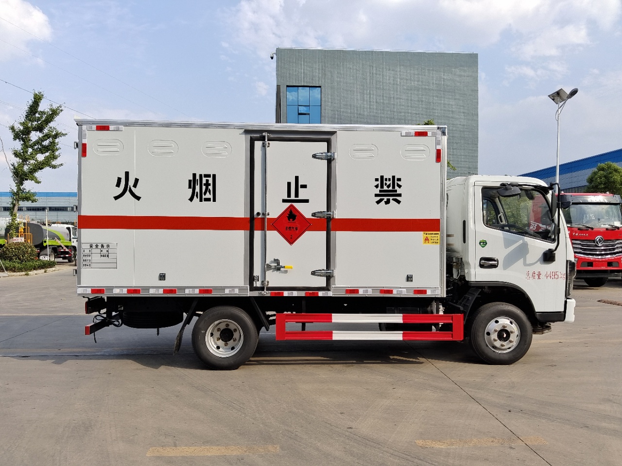 | 貨箱配置 | 廂體為雙層金屬骨架結(jié)構(gòu),外板采用冷軋鋼板,中間填充阻燃泡沫,內(nèi)飾為鋁板。底板為平板上鋪防靜電膠皮。廂內(nèi)兩側(cè)加裝固定貨物臥環(huán),門框帶防盜報警器,頂部帶煙霧報警器,廂體右側(cè)選裝側(cè)門,隨車配2個滅火器,危險標(biāo)志牌,防火帽,危險品三角頂燈。(也可用瓦楞板) | ||