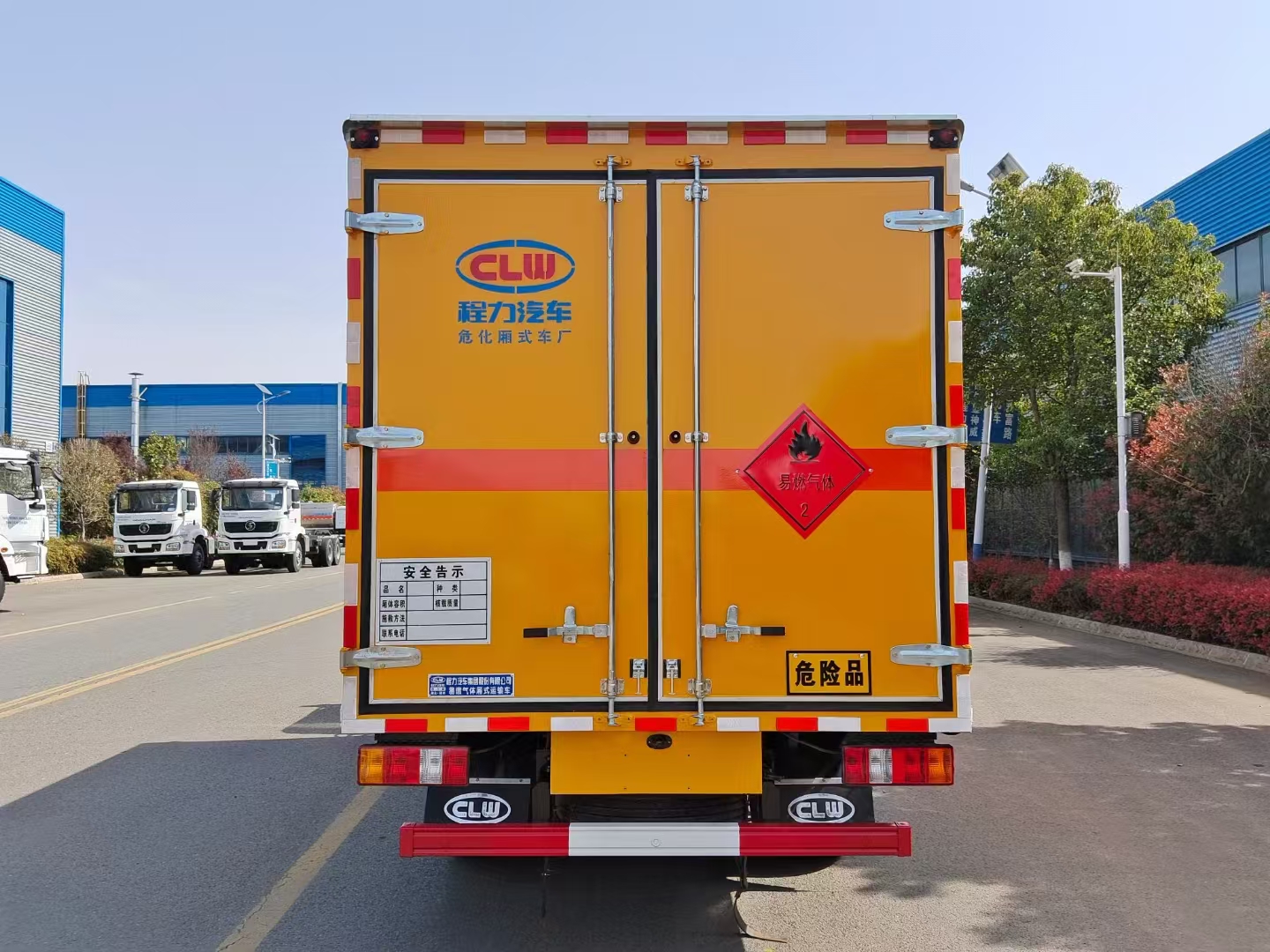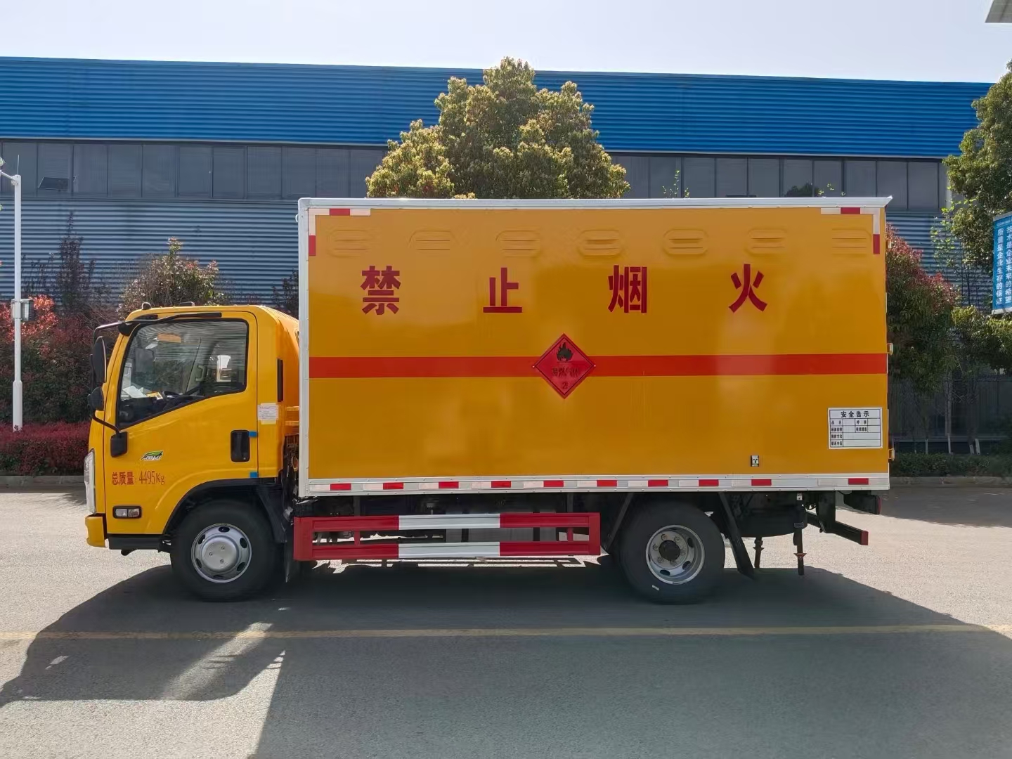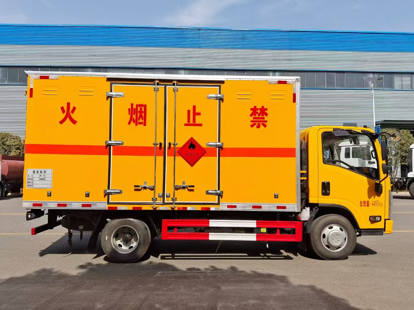 | 貨箱配置 | 廂體為雙層金屬骨架結構,外板采用冷軋鋼板,中間填充阻燃泡沫,內(nèi)飾為鋁板。底板為平板上鋪防靜電膠皮。廂內(nèi)兩側加裝固定貨物臥環(huán),門框帶防盜報警器,頂部帶煙霧報警器,廂體右側選裝側門,隨車配2個滅火器,危險標志牌,防火帽,危險品三角頂燈。 (選裝瓦楞板貨箱) (尾部可選裝液壓升降尾板) | ||