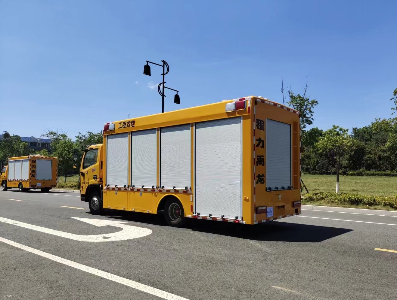 | 上裝配置 | 1、廂體外形尺寸根據(jù)實(shí)際公告標(biāo)準(zhǔn)。 廂體:具備運(yùn)輸、防雨、防火、阻燃、防塵、防銹、降燥,隔震、長期抗震結(jié)構(gòu)。外部鋼材為優(yōu)質(zhì)冷軋鋼板,表面處理平整,內(nèi)襯優(yōu)質(zhì)冷軋鋼板折彎骨架,強(qiáng)度牢固,配重合理。 2、廂體一體化鋼體結(jié)構(gòu)設(shè)計(jì), 頂部平坦。廂體采用骨架式夾層形式,外蒙皮采用厚1.5mm優(yōu)質(zhì)防銹處理的汽車專用冷軋鋼板,中間骨架采用防銹處理后的鋼管焊接,頂層、側(cè)圍內(nèi)、外層之間填充長時(shí)間使用對人體無害的防火阻燃環(huán)保吸音棉,外層鋪蓋一層阻燃金屬布,內(nèi)飾采用0.8mm厚網(wǎng)孔板。底板采用鋼結(jié)構(gòu)底框架,上表面鋪厚2mm花紋鋼板。 3、車輛廂體采用整體包覆式,廂體兩側(cè)下部設(shè)置裙邊式,全封閉式結(jié)構(gòu),頂部為圓弧型,尾部有轉(zhuǎn)向燈、剎車燈、尾燈、霧燈,箱體表面光滑平整。車廂靠駕駛室前部為休息室,休息室內(nèi)帶折疊坐椅及折疊桌,往后為機(jī)組室,機(jī)組室左、右側(cè)布置進(jìn)排風(fēng)百窗,設(shè)置機(jī)組檢修門一個(gè),下置登車踏步梯,車廂后端為后為卷簾門。右側(cè)排風(fēng)百葉窗下部為維修觀察艙門。左側(cè)下圍設(shè)置有工具箱及功能艙門等。右側(cè)下圍設(shè)置有汽車油箱艙、液壓控制艙等。 4、車廂尾部配置標(biāo)準(zhǔn)儲物貨架讓出水帶、加長電纜等附件存放有序、互不干涉,讓緊急排水搶險(xiǎn)變得更加快捷、有效。 5、廂體噴漆:工程黃,與車頭同一顏色; 6、最終的門數(shù),形式,打開方式嚴(yán)格按照合同要求依據(jù)程力公告生產(chǎn); | ||