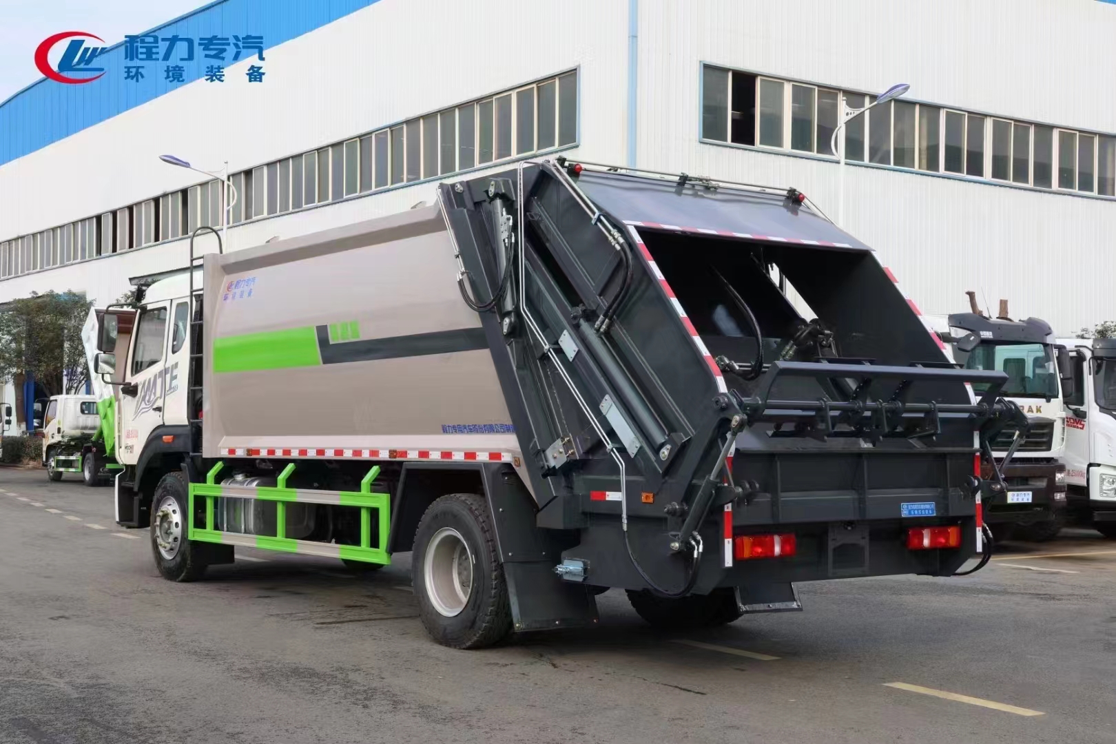 上裝配置 整車上裝箱體采用高強(qiáng)度鋼制作,容積約16/18立方,新式可破碎刮板,后置污水箱,雙向蠕動(dòng)壓縮,國內(nèi)知名品牌液壓系統(tǒng),恒力油缸,中梅多路閥,嘉善取力器,合資品牌睿辰鐵殼齒輪泵,駕駛室內(nèi)及車身外集中CAN電控系統(tǒng),尾部可選裝掛桶翻轉(zhuǎn)機(jī)構(gòu),帶氣動(dòng)后蓋,可實(shí)現(xiàn)垃圾桶的翻轉(zhuǎn)傾倒上料,亦可選裝擺臂裝置、三角斗裝置、大落地全密封斗裝置等進(jìn)料裝置。壓縮比高,液壓系統(tǒng)穩(wěn)定可靠,高品質(zhì)、高性價(jià)比!