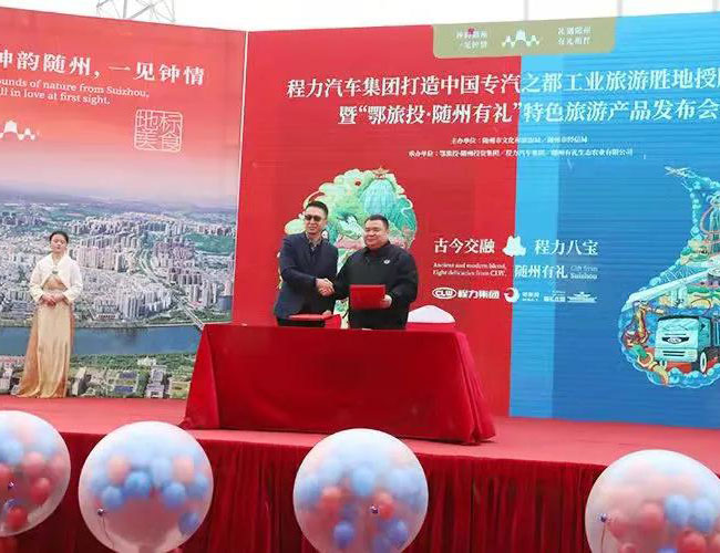 在程力工業(yè)旅游產(chǎn)品發(fā)布會(huì)上,程力汽車集團(tuán)總經(jīng)理程阿羅(左)與鄂旅投總經(jīng)理王濤,簽署了文化旅游戰(zhàn)略合作框架協(xié)議,雙方?jīng)Q定利用各自的優(yōu)勢強(qiáng)強(qiáng)聯(lián)合,共同開發(fā)工業(yè)旅游潛在市場,為隨州的經(jīng)濟(jì)發(fā)展增添新的動(dòng)能。